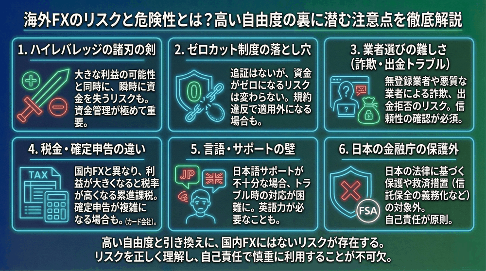 海外FXには、高い収益性を期待できる魅力がある一方で、国内FXにはない多くのリスクと危険性が存在します。