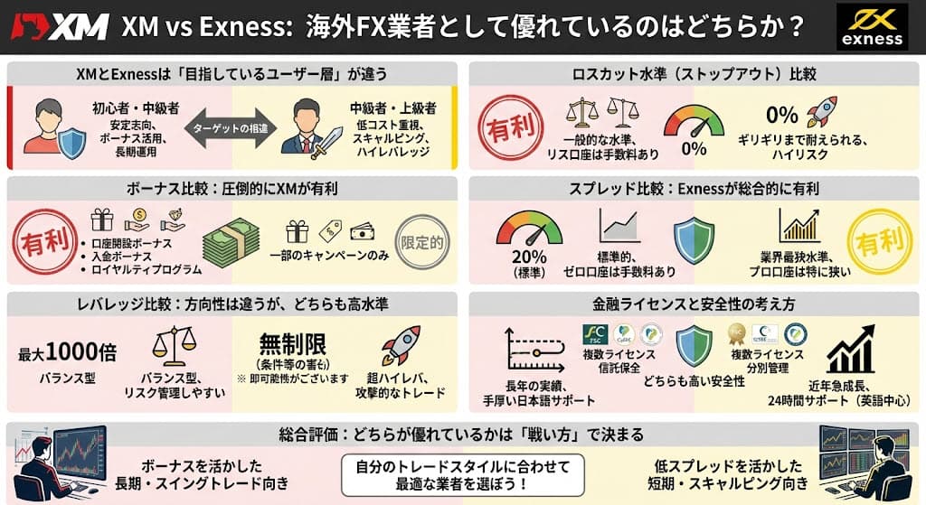 これは、「守られたい人」にはXM、「自由を取りたい人」にはExness、という安全性の捉え方の違いにつながります。